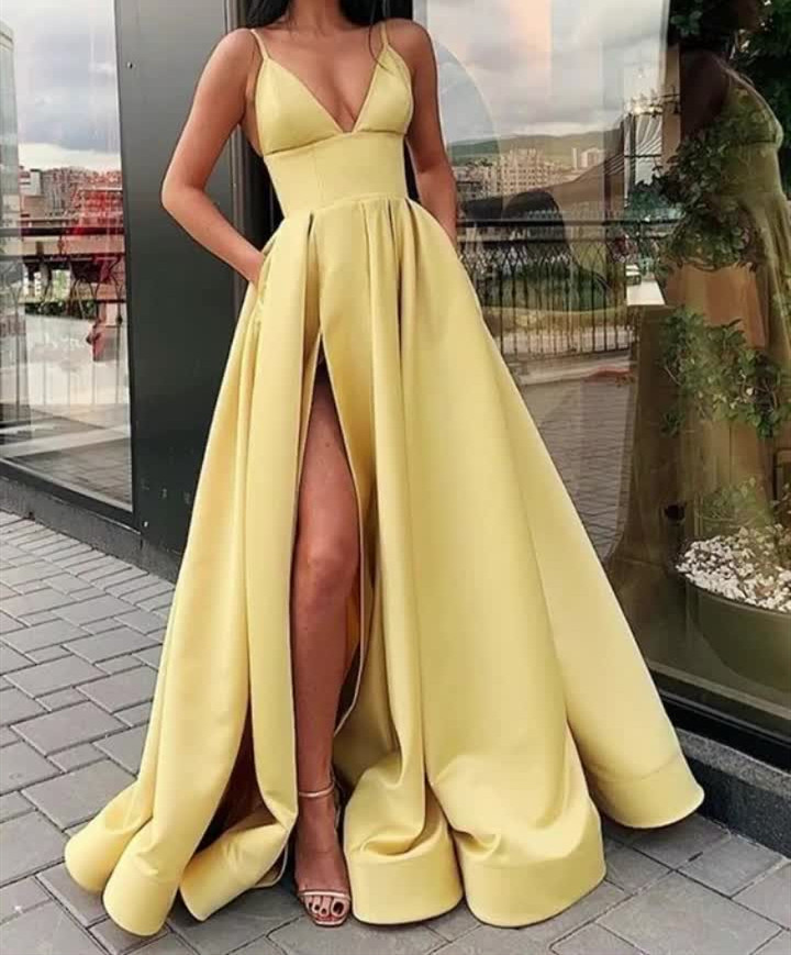 yellow sleeveless v-neck satin evening dress,satin slit-skirt spaghetti-straps prom dress,GGD0002