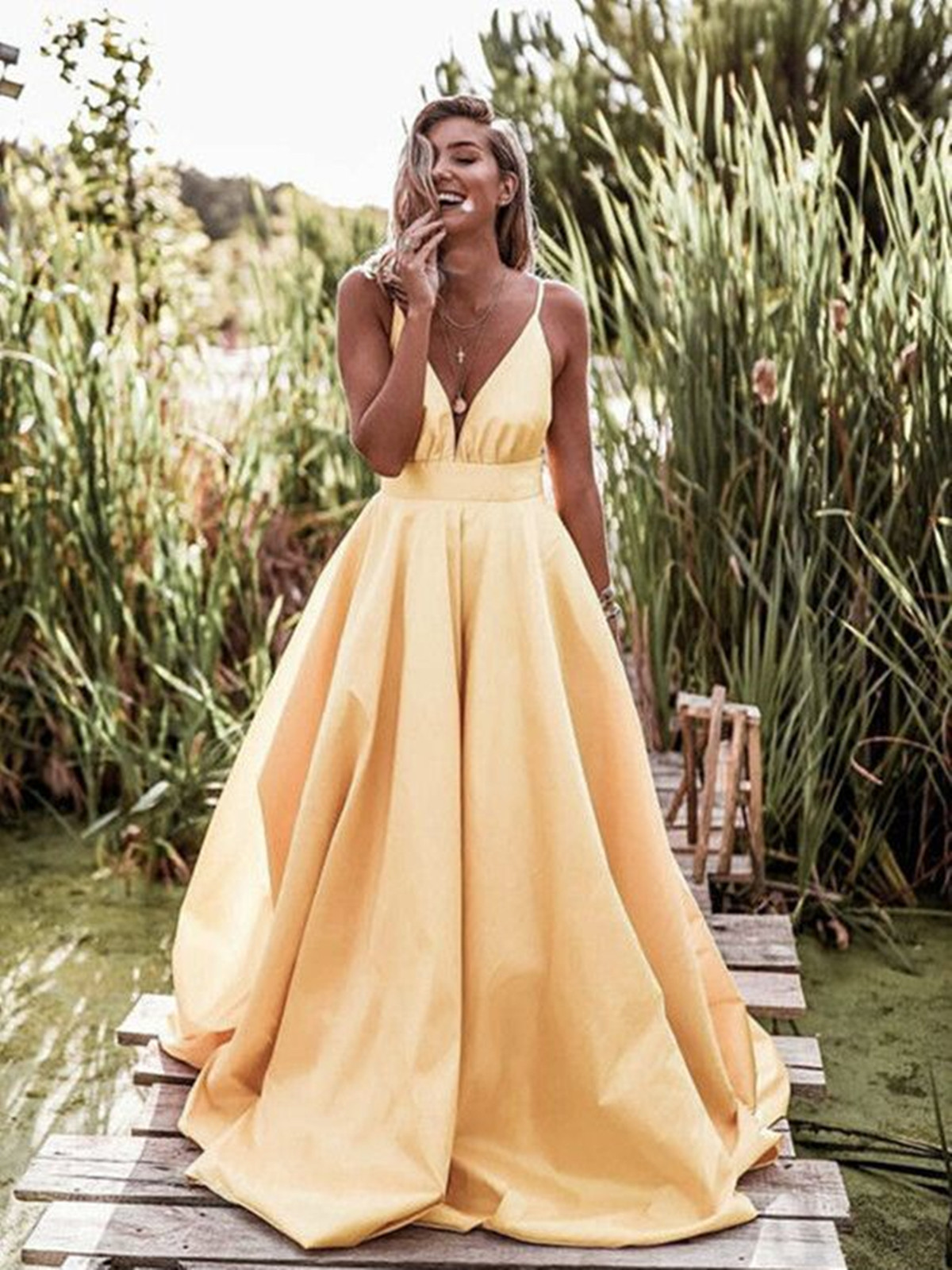 simple yellow sleeveless v-neck full length evening dress,satin spaghetti-straps prom dress,GGD0047