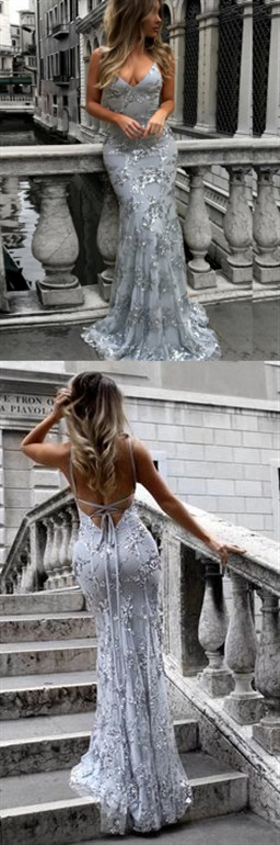 gray sleeveless v-neck tulle full length evening dress,applique spaghetti-straps backless prom dress,GGD0050