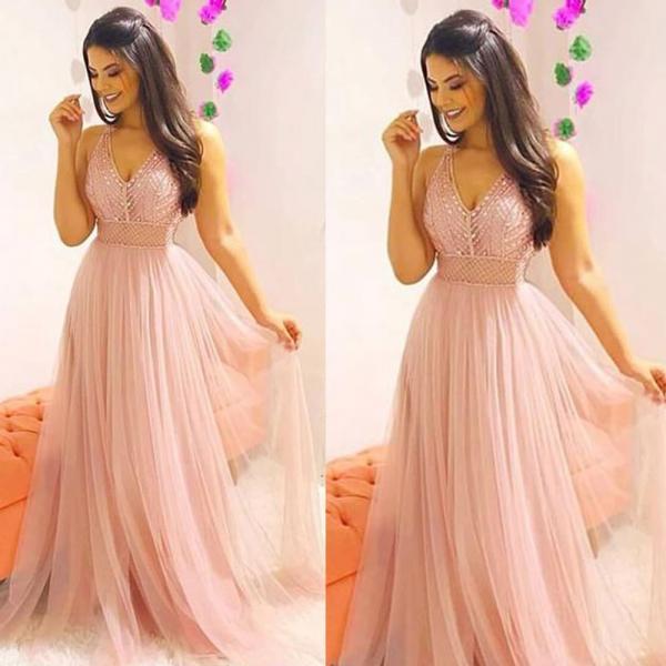 pink sleeveless v-neck tulle full length evening dress,applique beaded racer-back prom dress,GGD0106