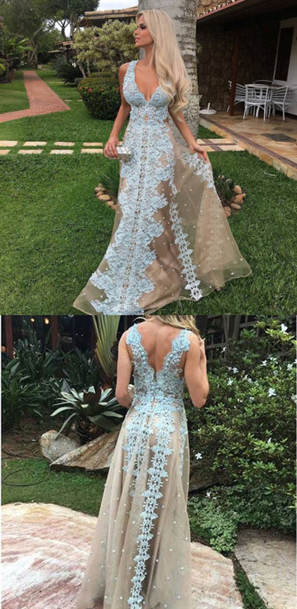 light green sleeveless v-neck full length evening dress,applique lace tulle prom dress,GGD0108