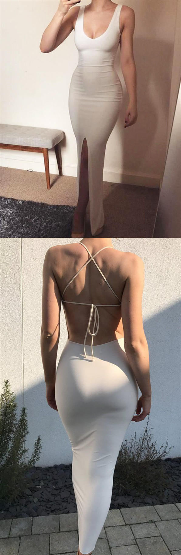 simple white sleeveless v-neck full length evening dress,satin backless slit-skirt prom dress,GGD0190