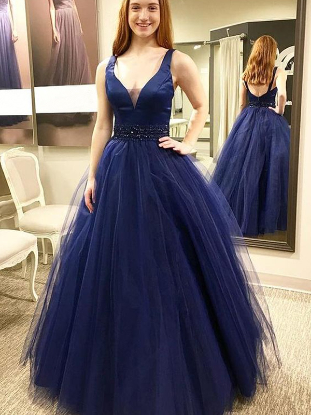 light blue sleeveless v-neck full length evening dress,beaded tulle satin prom dress,GGD0212
