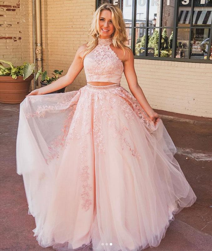 Pink two pieces lace high neck long prom dress,pink lace evening dress,GGD0226