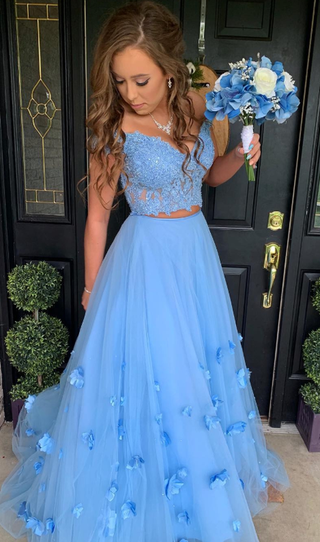 GGD0506,blue off shoulder v-neck cap sleeves two piece applique tulle lace evening dress