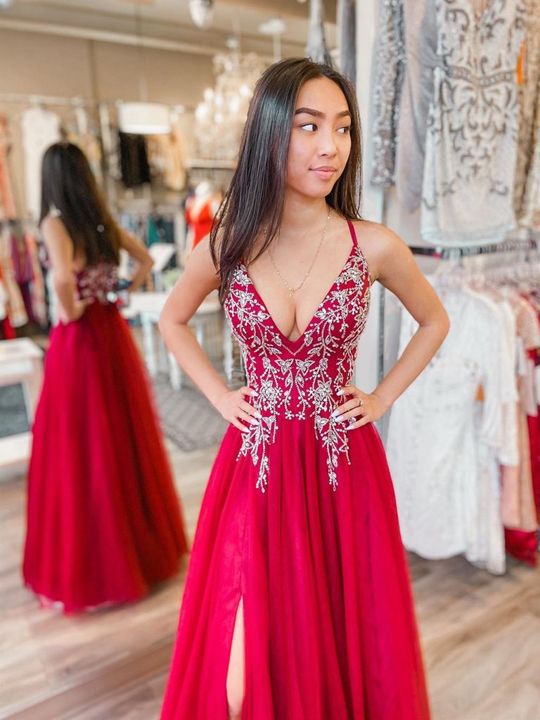 GGD0546,A-Line V Neck Beaded Red Long Prom Dresses with Slit V Neck Red Formal Dresses Red Evening Dresses