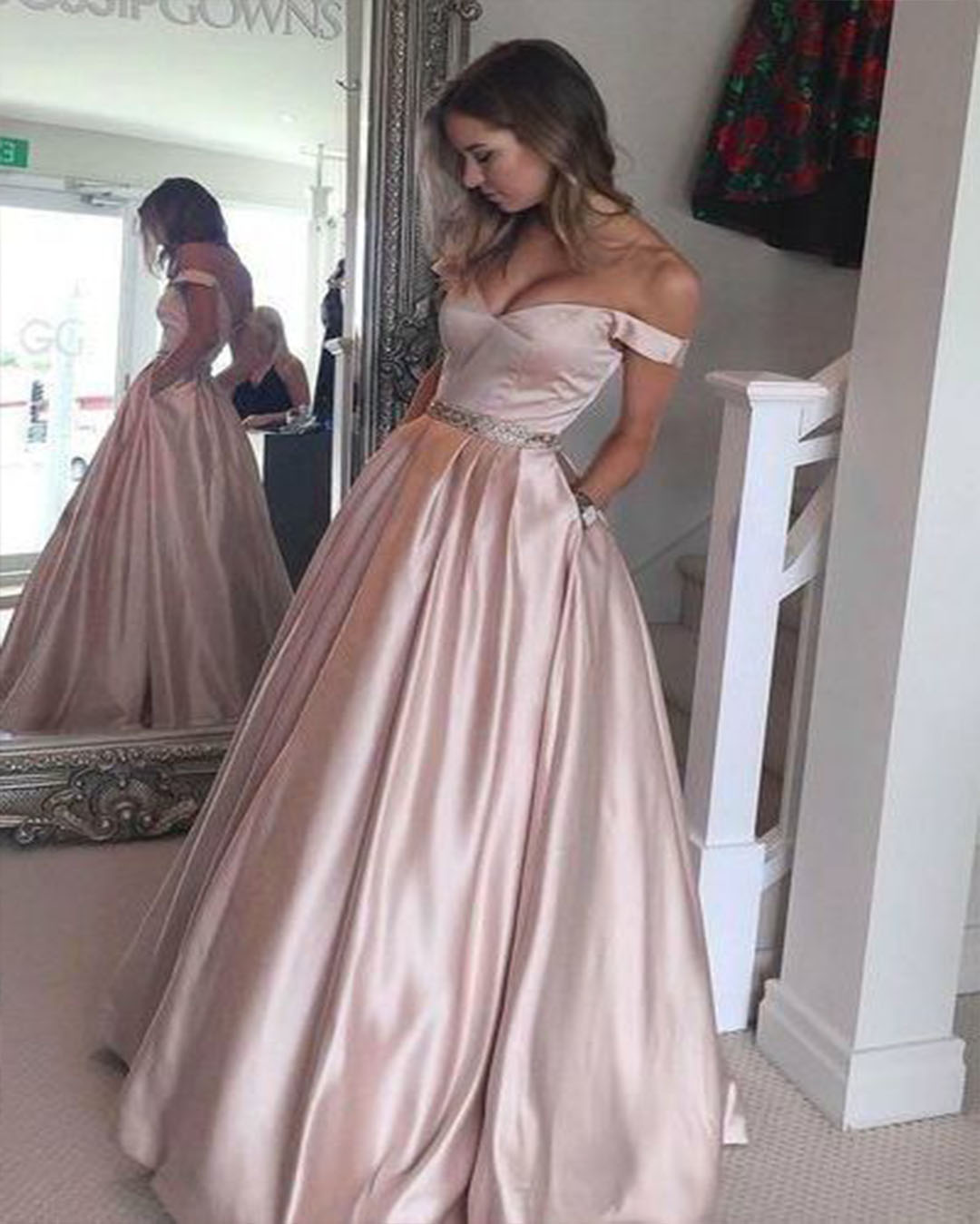 pink pocket satin full length evening dress,beaded off the shoulder v-neck prom dress,GGD0054