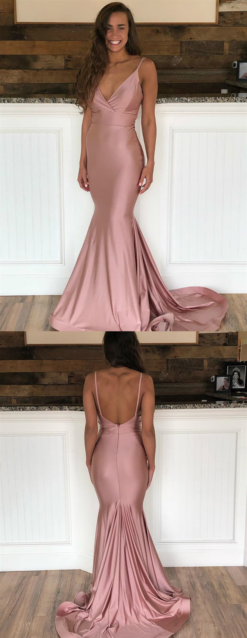 Pink V Neck Mermaid Satin Spaghetti Straps Backless Long Prom Dress,GGD0246