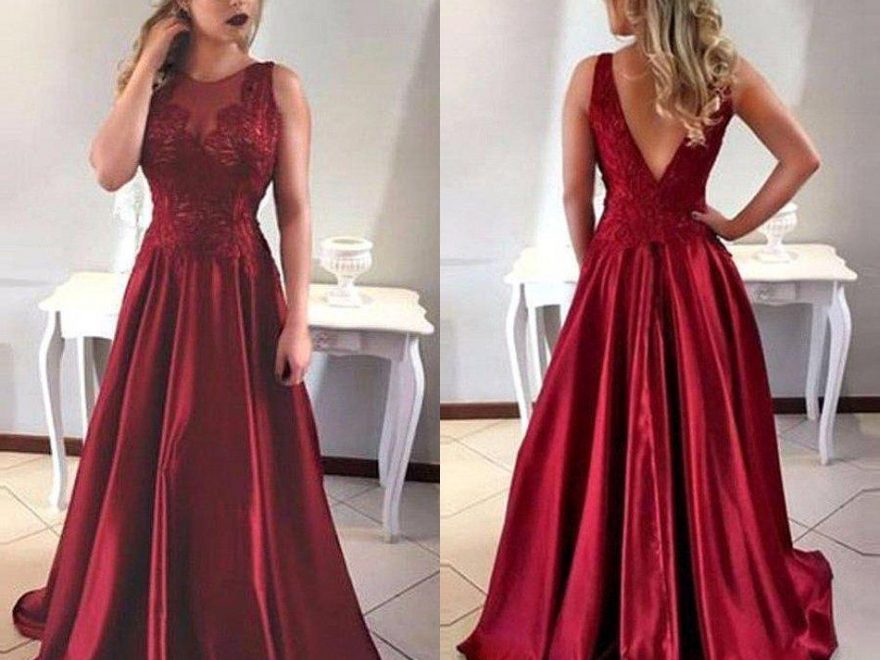 Charming Burgundy Satin Prom Dress with Applique,Sleeveless Evening Dress,GGD0248