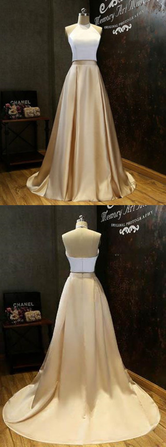 two piece satin full length evening dress,white sleeveless halter prom dress,GGD0256