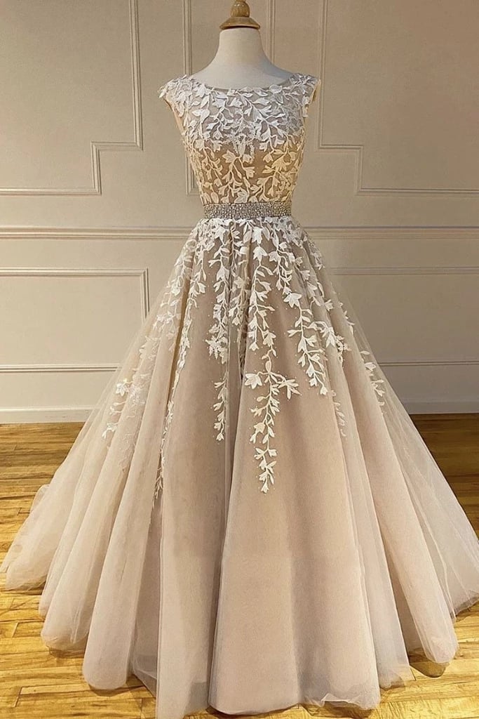Champagne Round Neck Applique Lace Prom Dress,Beaded Formal Dress,GGD0271