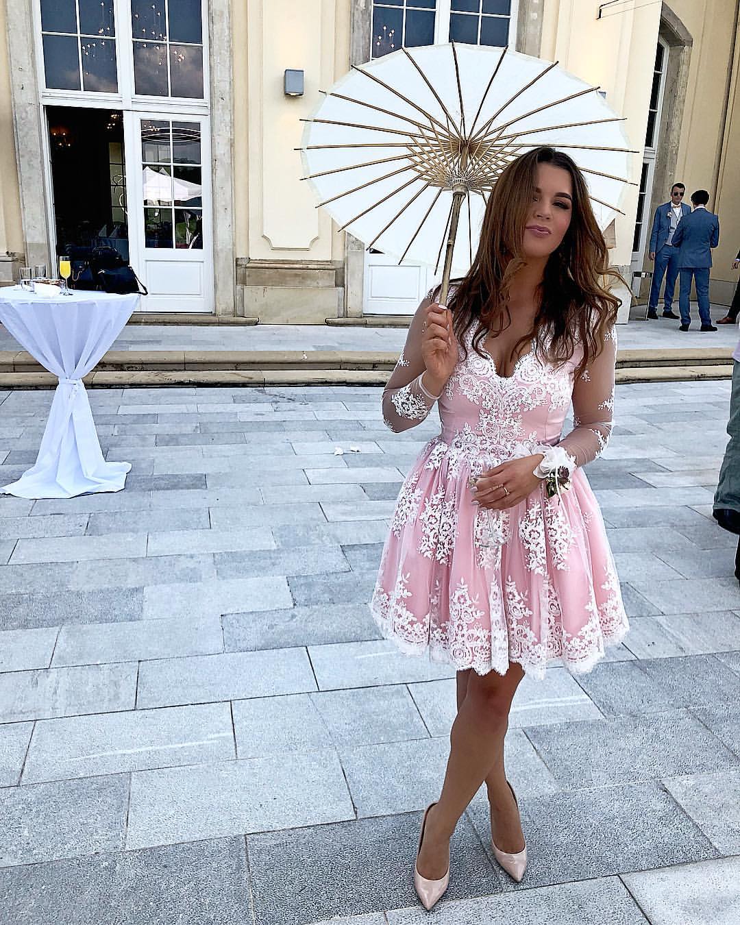 Cute V Neck Long Sleeve White Lace Homecoming Dress,Pink Short Party Dress,GGD0287