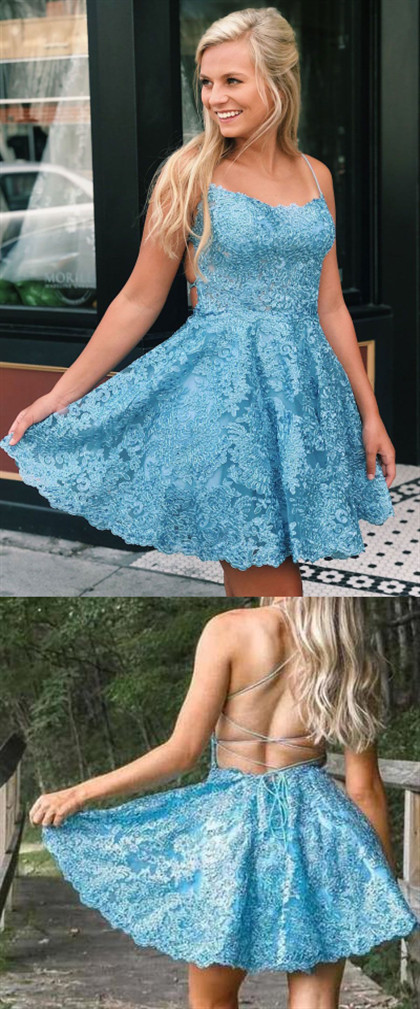 Scoop Neck Blue Lace Short Homecoming Dresses,A-Line Short Prom Dresses,Cross Back Cocktail Party Dresses,Back to School Dress,GGD0310