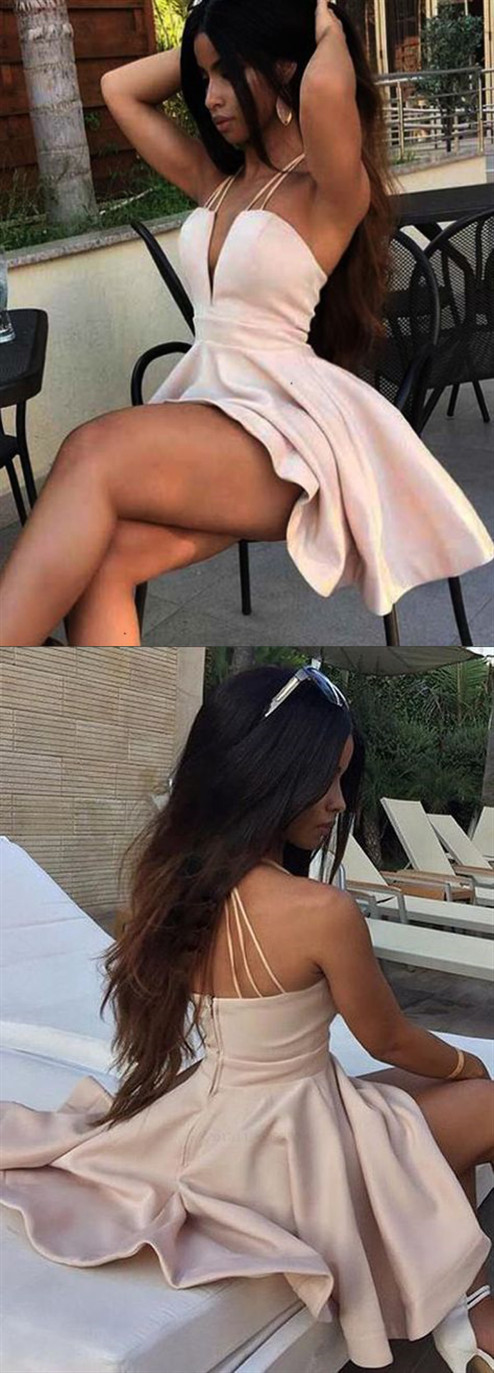 short pink sleeveless v-neck short evening dress,satin spaghetti-straps homecoming dress,GGD0314