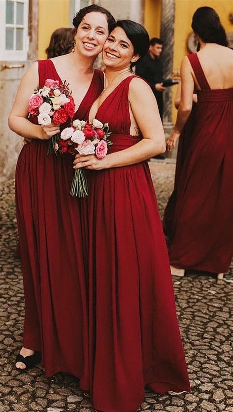 simple light burgundy sleeveless v-neck floor length evening dress,satin backless bridesmaid dress,GGD0333