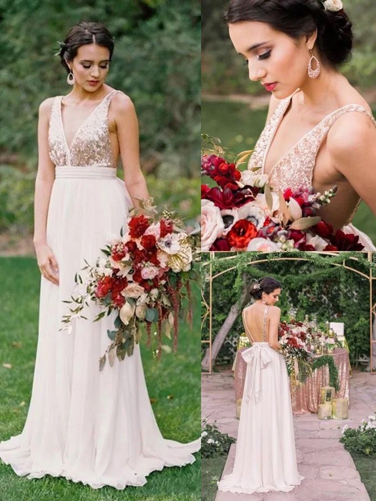 white sleeveless v-neck sequins party dress,backless chiffon bow bridesmaid dress,GGD0384
