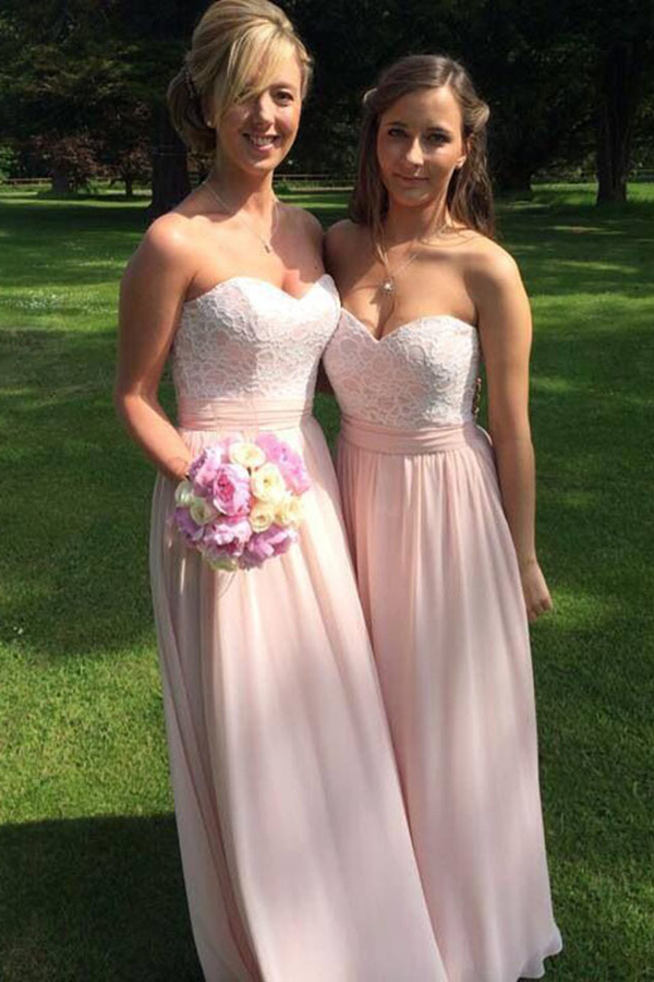 pink sleeveless sweetheart strapless lace full length evening dress,applique chiffon bridesmaid dress,GGD0385