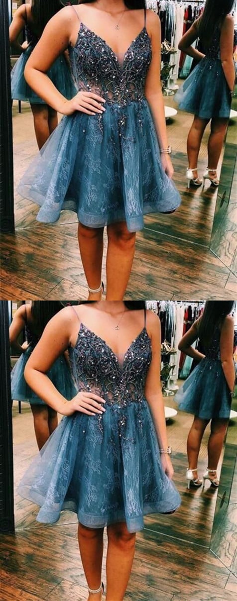 pretty blue lace sleeveless v-neck mini evening dress,spaghetti-straps tulle beaded applique homecoming dress,GGD0356