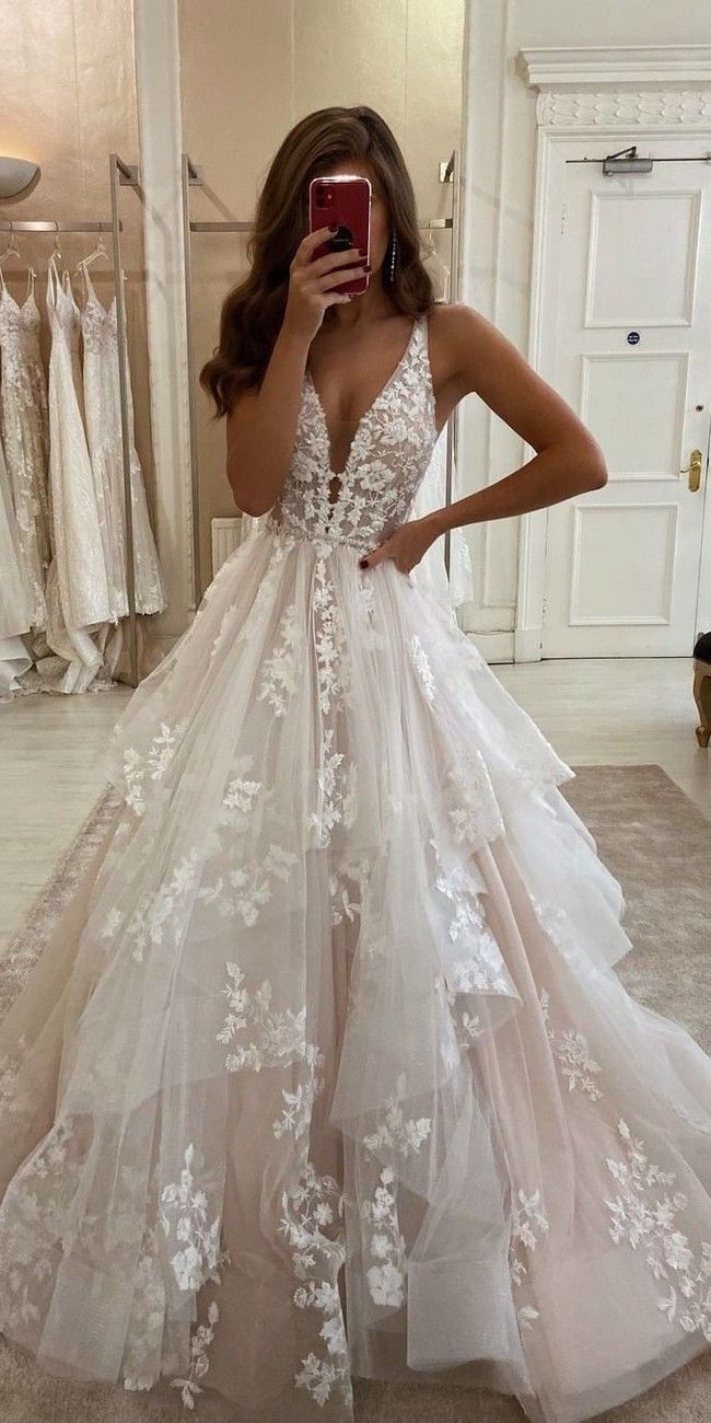GGD0046,white sleeveless v-neck applique ruffles tulle lace long wedding dresses