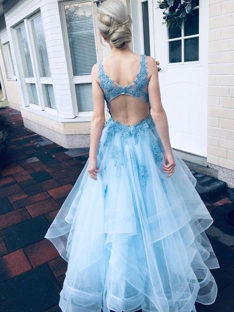 GGD0588,V Neck Open Back Light Blue Lace Long Prom Dresses Light Blue Lace Formal Graduation Evening Dresses